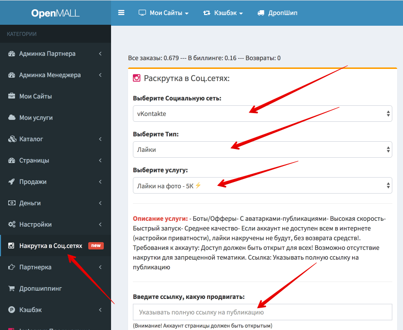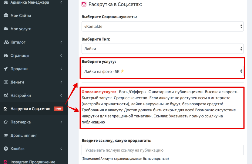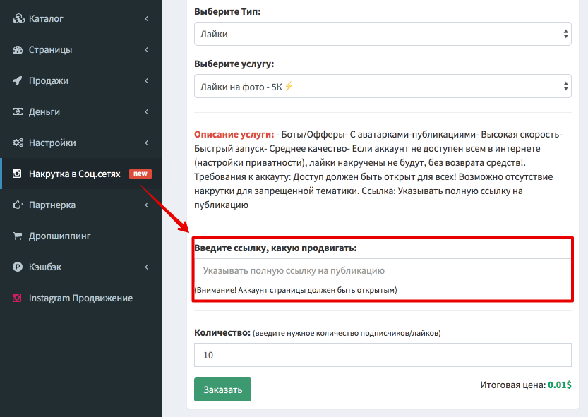 После успешной регистрации, Вы попадете в панель управления и слева можете видеть меню "Накрутка в соц.сетях". Здесь Вам нужно заполнить всего три поля: